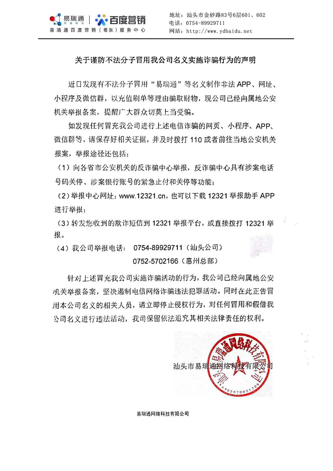 近期,我司發(fā)現(xiàn)社會上有不法個體、人員盜用我司品牌或公司名稱進行誤導(dǎo)性宣傳、開發(fā)市場并進行非正當業(yè)務(wù)往來,該類行為皆屬其個人(或團隊)行為,不代表本公司,本公司不承擔任何法律責任。并且該行為已經(jīng)嚴重誤導(dǎo)了消費者及我司客戶,嚴重損壞我司利益及聲譽。為避免造成廣大社會朋友的損失,惠州總部、汕頭分部、潮州分部三家公司發(fā)出以下公告: